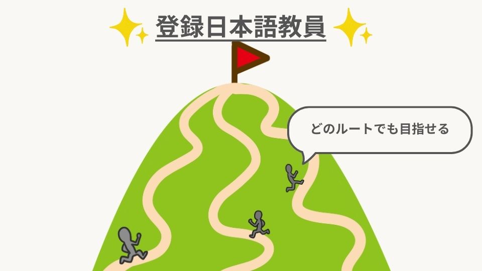 山登りの例のように、登録日本語教員を目指すルート(道のり)は、一つではありません。